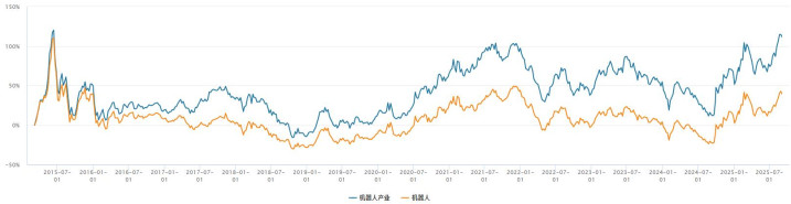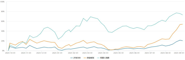 在政策利好与市场前景的双重驱动下,机器人板块已成为当下最炙手可热的投资领域之一。一级市场中,2025年上半年具身智能产业链上下游融资活跃度持续攀升,144次融资事件累计融资金额达195亿元,频次与融资规模均已超越2024年全年水平。二级市场上,机器人领域的核心零部件制造商、整机厂商及系统集成商表现亮眼,其股价和估值整体表现强劲,自2024年9月24日以来,机器人指数(884126.WI)累计收益率高达73.03%,大幅领先沪深300和创业板指同期表现,长期配置优势凸显。