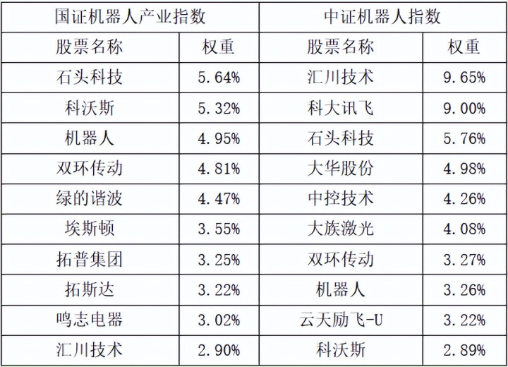 表格系国证机器人产业指数与中证机器人指数前十大成分股对比分析